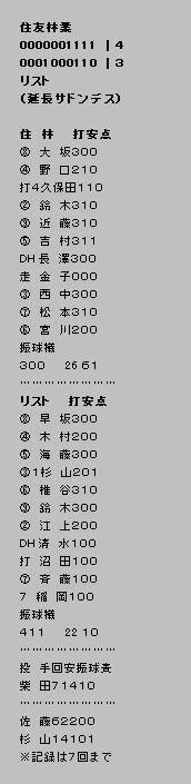 ベスト4進出を決めた。リストはあと一歩のところで勝利を逃した。 試合は住林・柴田、リスト・佐藤の両エースの息詰まる投手戦で始まった。 1点を追う住林は最終回、この回から代わったリスト・杉山投手を攻め、 2番・久保田から3番・鈴木、4番・近藤、5番・吉村まで5連打を放ち同点に追いついた。 しかし、その後の無死満塁の好機を生かせず、試合は延長戦に。 延長戦(1死満塁で攻防)では8回、9回とも1点ずつとりあいケリがつかなかったが、 10回、住林は3番・鈴木の犠飛で1点を奪い、その裏のリストを0点に抑え逃げ切った。 柴田投手は7回まで1失点したが、味方の失策がらみの失点で、自責点は0。 わずか1安打に抑え10回を投げきった。 リストは4回、この回先頭の木村が敵失と暴投、外野飛球で3進したあと、 4番・杉山の犠飛で貴重な先取点を奪った。 その後は、攻略の糸口がつかめず5回以降は7回まで三者凡退に討ち取られた。 延長8回には、3番・海藤のこの試合2本目の安打で同点に、 9回にはまたも海藤の四球で同点に追いついたが、10回には海藤、杉山が凡退してジ・エンド。 柴田投手に完璧に抑えられた。 先発の佐藤投手は6回まで許した安打は2本、4回から6回までは三者凡退に抑えていたが、 7回から登板した杉山が痛打を浴びた。 〇坂東監督 次はリバブル? 最近は対戦していないので…よく分からないが、 先発はもちろん柴田 〇宮川 柴田さまさま 〇吉村 僕が同点打を放ったんです(と、自画自賛) ●伊東監督 後攻めなので有利かと思ったが…打てなかった。相手のピッチャーがすごい ●元ロッテ・倉持コーチ 僕は現役を退いた22年前から、代々木の軟式チームを作り、 国体を目指して15年間采配をふるってきた。都大会の準決勝まで進んだのが最高の成績。 リストは若い人材も入ったので、これから強くなる ●海藤 傷口に塩をすり込むようなことをしないで。 相当ショックを受けているんだから(と、コメント拒否。 初回、1死1塁から右翼前に快打を放ったが、やや気を抜いたか右翼ゴロに倒れ、 8回、9回とも同点に追いつく打点を放ちながら、10回に三振したのがよほどこたえている様子だった。 しかし、今大会は絶好調で、毎試合のように安打を放ち、チームを引っ張った) 勝つには勝ったが…住林の課題 住林は勝つには勝ったが、拙攻も目立った。 いくつか列挙すると@初回、1死から野口が3塁打を放ったが、 続く3番の鈴木とのサインミスで野口が飛び出し憤死 A同点に追いついた7回には無死満塁の好機を生かせず B延長8回、1点を取ったあと、暴投でらくらく1点追加と思われるシーンで3塁走者が動かず C延長8回、久保田のファウルグラウンドからインフィールドに転がる打球にも3塁者の反応が悪く本塁憤死 ――など。このうちの一つでも得点できていればもっと楽な戦いができたはずだ。 暴投で捕手が球をそらした瞬間を狙って 3 塁走者が生還した旭化成ホームズと対照的だった。 |