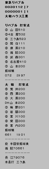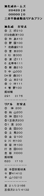 リアルプランは王者と戦えることを喜んでいるようで、舞い上がっていた。 旭化成は初回、いきなり先頭の三好、2番・杵島が連打、続く3番・野国が四球で満塁とし、 4番・宮本は倒れたが、5番・渡辺の死球で1点先制、なおも暴投で1点追加。 3回には 4 四球に 8 番・山本の犠飛、 9 番・小林の適時打などで 4 点を奪い試合を決めた。 4回にも 4 番・渡辺と山本の適時打で 2 点を加点して突き放した。 先発・今野が 4 回を 1 安打 4 奪三振、その後を平山が継いで完封勝ち。 リアルプランの先発は、これまで先発していた志保沢ではなく原。四球から走者をため痛打を浴びた。 3 回途中から志保沢が登板したが、流れを変えられなかった。 〇今野 気持ちよく投げられた。次? 先発は僕じゃないんじゃないですか ●吉田監督 相手は野球がうまい。でも強いチームと当たって自信がついた。 来年はよりパワーアップしたい。いい夏だった |