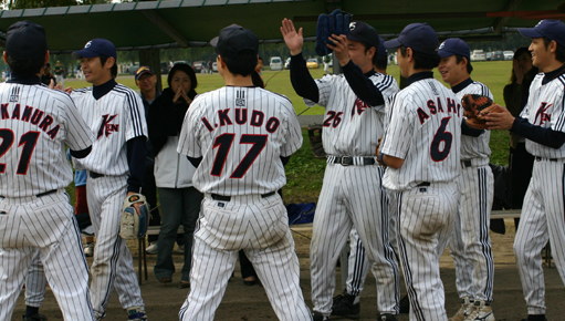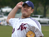 三井不動産に痛い失策が出てケンコーポが逃げ切った。 1点を追うケンコーポは4回、この回先頭の3番・庄司が3塁ゴロ失策で出塁。 盗塁と次打者・渡辺の進塁打で3進。さらにパスボールで生還。 三井の拙守につけこんで同点に追いついた。 こうなると流れはケンコーポに。1−1の同点のまま延長サドンデス(1死満塁で攻防)になった8回表、 2番・笠の3塁ゴロ失策で2点奪取。庄司敬遠のあと、 4番・渡辺の中堅前安打でさらに2点を追加して試合を決定づけた。 庄司投手は、初回こそ1失点したが、2回以降は一人の走者も許さない完璧のピッチングで三井打線を抑えた。 三井不動産は初回、立ち上がりの庄司を攻め、2番・福田が死球で出塁。 盗塁を決めたあと、3番・溝口、4番・肥田の東大出コンビの連打で1点を先取。 しかし、その後は、7回まで6三振を喫するなど、1人の走者も送ることができず惜敗。 木下投手は肩痛をおして登板。 気迫の投球で7回を2安打に抑えたが、味方の拙守に泣いた。自責点はゼロ。 登板するかと思われた志村投手は欠場。細井捕手も欠場した。 ○田辺監督 三井さんとはこのところ4試合連続でサドンデスとなり、全て勝っている。 延長では渡辺がよく打った(笑いをかみ殺していた。 4試合連続のサドンデスは田辺監督の記憶違いで、実は今大会を含め3大会で両チームは5度対決。 全て接戦でケンが5連勝。うち3試合が延長戦、1度がサヨナラ勝ち) ○庄司 言い訳にはならないが、初回は練習不足。 キャッチボールしかやっていなくて、いきなりの登板だった。木下投手はいい投手。 投げあっていて楽しい ●大町監督 木下はよく投げた。…(あとは無言) ●木下 残念です ●肥田 1点じゃ勝てない |