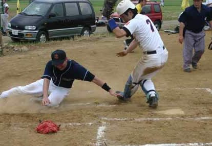 2回裏、内野ゴロで本塁をつくもアウトになった清水・山中選手(左) |