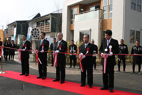 1期50戸の竣工式・申し込み開始 「東京の住宅は狭くて高すぎる。3割は安く供給できるはず」という石原慎太郎都知事の発案で始まった「東村山本町地区プロジェクトむさしのiタウン四季の街」の1期竣工式が2月10日(土)、現地で行われ、50戸の申し込みも始まった。 同プロジェクトは、西武新宿線東村山駅から徒歩7分の約10ヘクタールの都営住宅跡地で開発中の全280戸の戸建て団地。「東京の住宅は狭くて高すぎる。3割は安く供給できるはず」という石原都知事の発案により事業コンペが行われ、当選したアキュラホーム、東日本ハウスなど17社5グループで構成される東京工務店が事業主となっているもの。東京工務店は東京都と70年の定期借地権契約を結び、開発・分譲・管理・運営を行う。 竣工式には石原都知事も参加する予定だったが、体調不良のため欠席。代わって出席した横山洋吉副知事は、「今日は、誰よりもこの日を待ち望んでいた石原都知事が欠席しましたが、低廉で良質な住宅の価格を3割下げるという実験住宅が完成して大変喜ばしい。今後もこのノウハウを広く公開し、住宅の構造改革に都も取り組んでいきたい」と挨拶。 事業者を代表して東京工務店・作間秀樹社長は、「先月13日にモデルハウスをオープンして約1400組の来場者がある。大変盛況だが、これからが勝負。安くて、安全で、美しい街づくりを行っていきたい」と述べた。 この日、申し込みに訪れたサラリーマン(58)夫婦は、「二人とも田舎の出身。借地権というのは少し気になるが、ここだったら庭いじりもできるし、子どもが生まれた娘夫婦と一緒に楽しい生活ができそう。気に入ったのは『木の香る家』」と語っていた。 受け付け開始1時間で5倍の競争倍率となった「木造ドミノ」を建設した相羽建設・相羽正社長は「地域工務店として多くのハンディがあったが、ランクの高いものができた。市場価格の半値以下でしょう。よく頑張れたと思う」と語った。