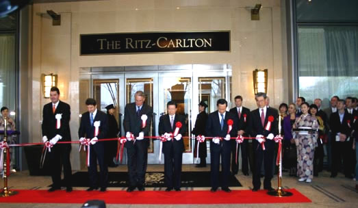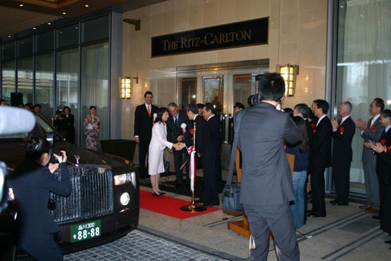 サ・リッツ・カールトン・クーパー社長&三井不動産・岩沙社長があいさつ 「東京ミッドタウン」が3月30日(金)グランドオープンし、早朝から「ザ・リッツ・カールトン東京」、「外苑通り地下通路開通記念式典」「グランドオープニングセレモニー」などが行われた。 ザ・リッツ・カールトン東京のオープニングセレモニーは8時30分から同ホテル1階エントランスで行われたが、8時過ぎから突然、雷と風を伴った大雨が降りだし、多くの関係者、内外の取材陣がふるえあがる中で行われた。 挨拶に立った同ホテル社長兼最高運営責任者サイモン・クーパー氏は、「日本では12年前、阪神電鉄さんと協力して大阪に開業したのがスタート。以来、東京でも探していたが、このような素晴らしいホテルが完成してとても嬉しい。上質なホテルには3つの条件が必要で、1つはロケーション、2つ目は設備、そして3つ目はベンチマークとなるようなサービスだ。条件は全て揃った。みなさんの信頼に応えられるようお迎えしたい」と語った。 続いて挨拶した三井不動産・岩沙弘道社長は、「ホテルを中心とした様々な施設が融合的に機能する21世紀型の街づくりを進めてきた。2003年にクーパーさんとお会いし、リッツ・カールトンが同施設のテーマである上質の日常≠ノぴったりということで東京進出が決まった。これからもよきパートナーとして最高のホスピタリティの実現を目指す。日本の方だけでなく、世界の方々に楽しんでいただきたい」と述べた。 一連のセレモニーが終わる頃、「東京ミッドタウン」の空は春雷がうそのように晴れ渡っていた。 ファースト・ゲストの一般客(中央の女性)を迎える関係者。左の車は女性が乗っていたロールスロイス・ファントム 10時15分から行われたグランドオープニングセレモニーのテープカット( 左から六本木商店街振興組合・後藤譲理事長、東京ミッドタウンマネジメント・市川俊英社長、三井不動産・岩沙弘道社長 マリオットインターナショナル・ジェームズ・サリバン副社長、赤坂第一商店会・今野信三会長) |