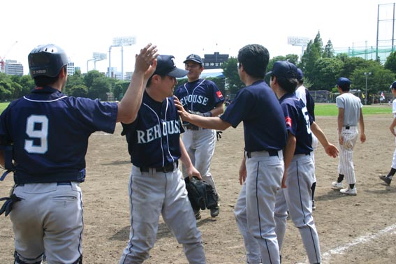 リストはエース佐藤が不調 主力の左打線も沈黙 勝利に沸くリハウスナイン 三井リハウス東京が強豪リストに快勝。入社半年の左腕新人ハジライ王子≠アと長嶺投手(23)が完投こそ逃したが、強打のリスト打線を5回3分の2投げて2安打2失点に抑える快投をみせた。打線もリストの好投手・佐藤を攻略2回に一挙5点を挙げた。リスト佐藤投手は制球を欠き、主力の左打線が抑えられた。 リハウスは2回、内野安打と2死四球で無死満塁の好機を作り、8番・小池の内野ゴロでまず1点、9番・藤田が押し出しの四球を選び追加点を挙げた。続く1番・引地が左翼前に運び1点追加。その後も押し出しと4番・小泉の犠飛で2点を挙げ、この回大量5点をもぎ取った。