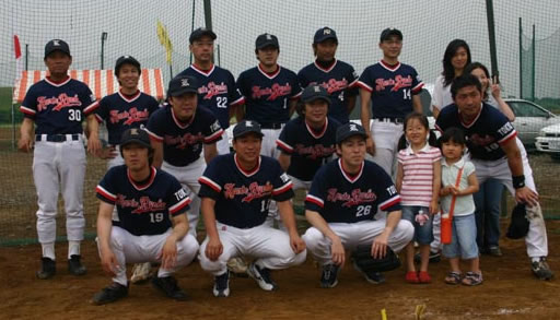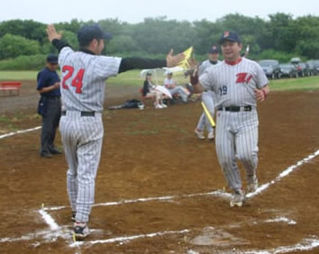 福田の適時打で生還する三井・福田選手 工藤新監督兼捕手 これまでの関東菱重興産のユニフォームで記念撮影する菱重エステートナインと応援団(新しいユニフォームは発注済だが、「出来上がるまでここにいられるかしら」と心配する声も)