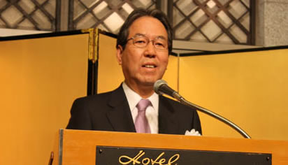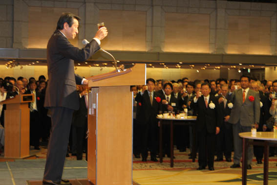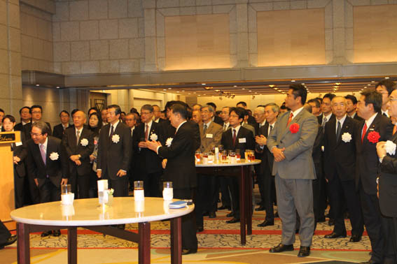 RBA HOME> RBAタイムズHOME >2013年 > 「成長」「飛躍」「前進」−明るいムードに包まれた 不動産協会とFRKの平成25年新年賀詞交歓会 参加者は昨年より10%増 挨拶する木村不動産協会理事長(ホテルオークラで) 不動産協会(理事長:木村惠司三菱地所会長)と不動産流通経営協会(理事長:袖山靖雄東急リバブル取締役相談役)の平成25年新年合同賀詞交歓会が1月8日、都内のホテルで行われた。民主党政権から自民・公明党による安倍新政権が誕生したことを受けて、参加者は昨年の約840名から約920名に増加、「明るい年」「成長」「飛躍」「前進」などの声が飛び交い、これまでの鬱憤を晴らすかのような明るいムードに包まれた。 冒頭、挨拶に立った木村理事長は、「昨年は安倍新内閣の誕生によって金融緩和が打ち出され、株高に象徴されるように大きな転換期を迎えている。また、年末年始の商業施設も売り上げが伸びており、明るい予感、高揚感が満ちている」としながらも、「安倍新政権は金融緩和と機動的な財政政策、内需を中心とする成長戦略の3本の矢で経済の再生に当たっていくということだが、実体経済にどう結びつくか注視しなければならない」と慎重な構えも見せた。 また、税制、雇用、社会保障などの問題については「生産人口比率がどんどん下がっていく将来の日本の姿を見据えてイノベーションする必要がある」と抜本的な改革を求めた。 不動産マーケットについては「マンションは堅調に推移しているが、住宅着工はまだまだ増やせる余地がある。オフィスは、昨年後半になって需要が増え空室率は下がってきており、賃料についても底入れ感が広がっている」とし、消費税問題については「5%を超える部分については消費者の負担が増えないように還付することを(政府に)お願いしている」と語った。 さらに都市問題について「アジアの核となるような魅力的な街づくりを進めなければならない」とし、安心・安全や環境問題への取り組みの強化について述べ、海外進出についても「ノウハウ、英知を結集して不動産事業が輸出できるよう協会としても支援していく」と語った。 乾杯の音頭を取った袖山理事長は「流通事業は震災後落ち込んでいた取引件数は戻ってきているが、取引価格は緩やかな下落が続いている。政府が規模の倍増を打ち出した成長戦略に沿ってさらに安心・安全の取引の実現を目指す」と話した。